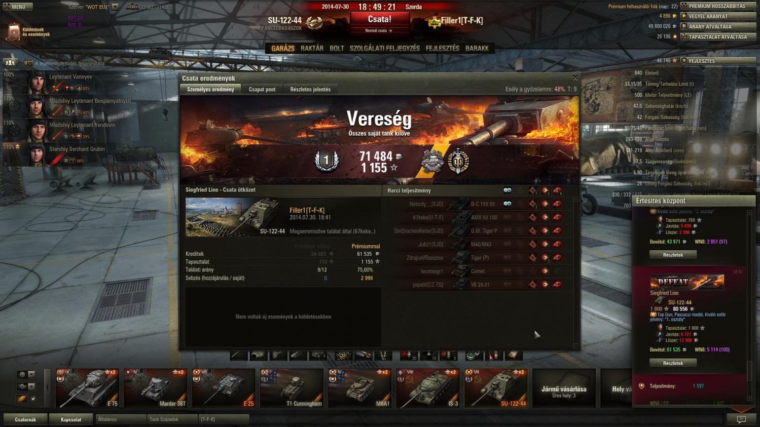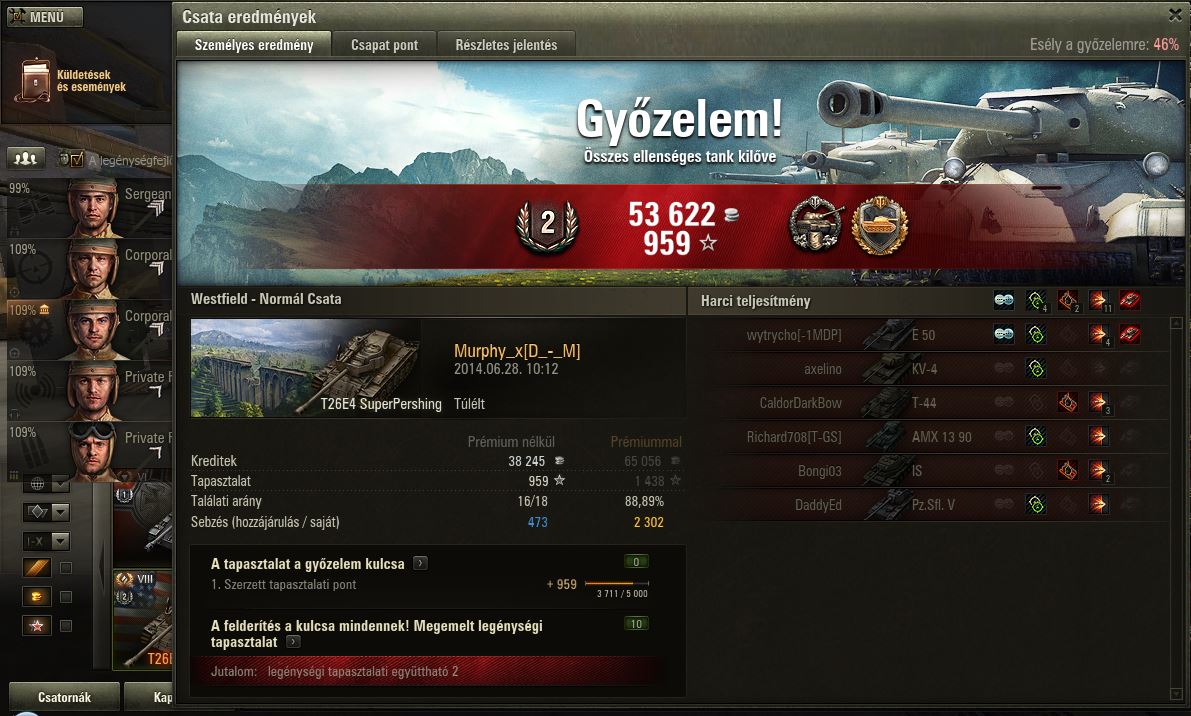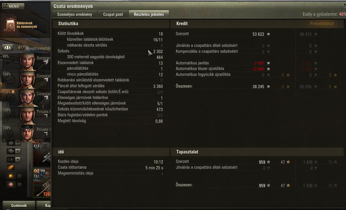 Ma pl 72,8%-os winratem volt 22 csatát nyomtam le, és összesen 16-ot nyertem, de csak 29k sebzést osztottam ki. Csak a Jagdpantherrel és a T25/AT-vel mentem, mindkét esetben a legénységet húzom, mert ki van már fejlesztve a JPII és a T28 is, de még kell 1 milla credit a JPII-höz, meg 2,6 milla a T28-hoz. A T25/AT már elit, meg is tartom majd, 57%-os winratem van vele, ami egész jó. Átlag 25-30K credit/csata amit hoz bruttóban.