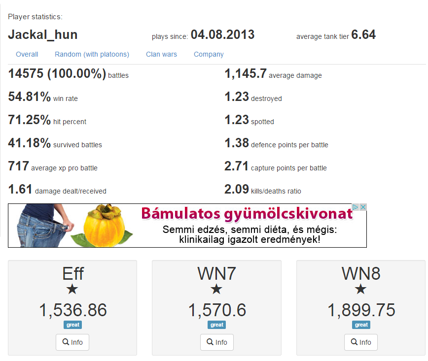 Dozer: sosem trollkodnám szét más accát. Tudom. hogy neked volt, egy nagy accod. Azért hoztalak fel példaként, mert a kezdeti "alacsonyabb" WN8-ad mára szépen feljött, szóval a kezdeti hátrány (nincs pénz, legénység, felszerelés stb.) szépen eltűnt. Amit abbahagytál acc. azon hány csata volt?