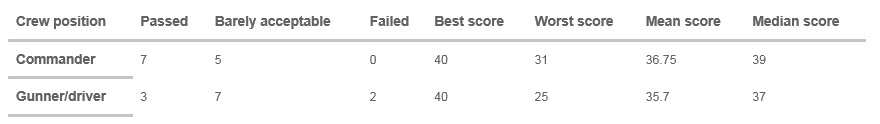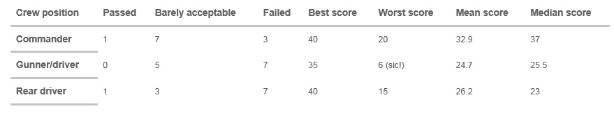 Az eltérést a számokban az okozza, hogy az egyik harcjármű parancsnok nem vett részt az 1. teszten.