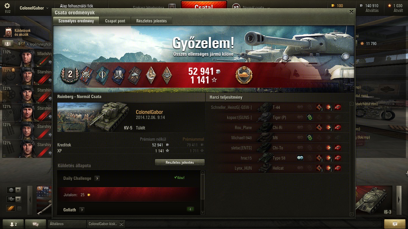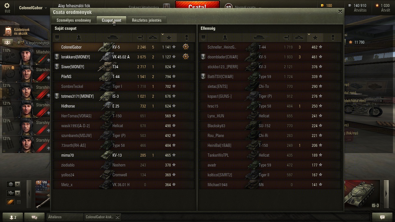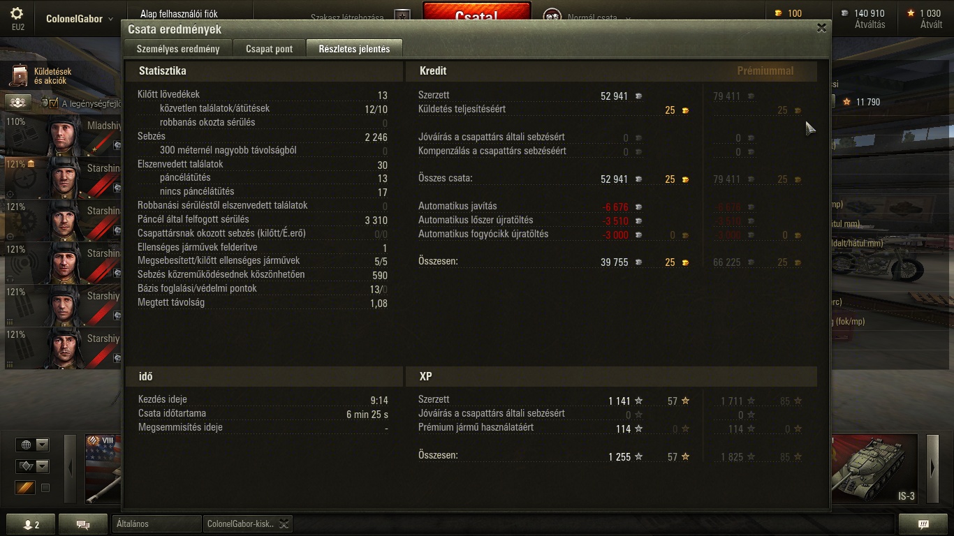 Hát nem is tudom ezt a tipikusan noob fogo tank dolgot én nem igy élem meg. van egy alap taktikám a csata indulásakor elmegyek kávézni és mikor a számláló 13:00 alá bukik akkor megnézem hol a legnagyobb a kavalkád, padlógáz, rammolás a sűrűben, tank forgatása, torony forgás max dpm kitolás, és amennyiben nem agyhalott a csapatom már nyertem is tapasztalataim alapján az esetek 10%-ban van olyan ember az enemyben aki felismeri a helyzetet és tud/tesz ellenem. De a kérdésemre a választ megkaptam. Köszönöm mindenkinek. Az alábbi képek egy olyan csata eredményei ahol a fentebb leirt taktikát alkalmaztam.