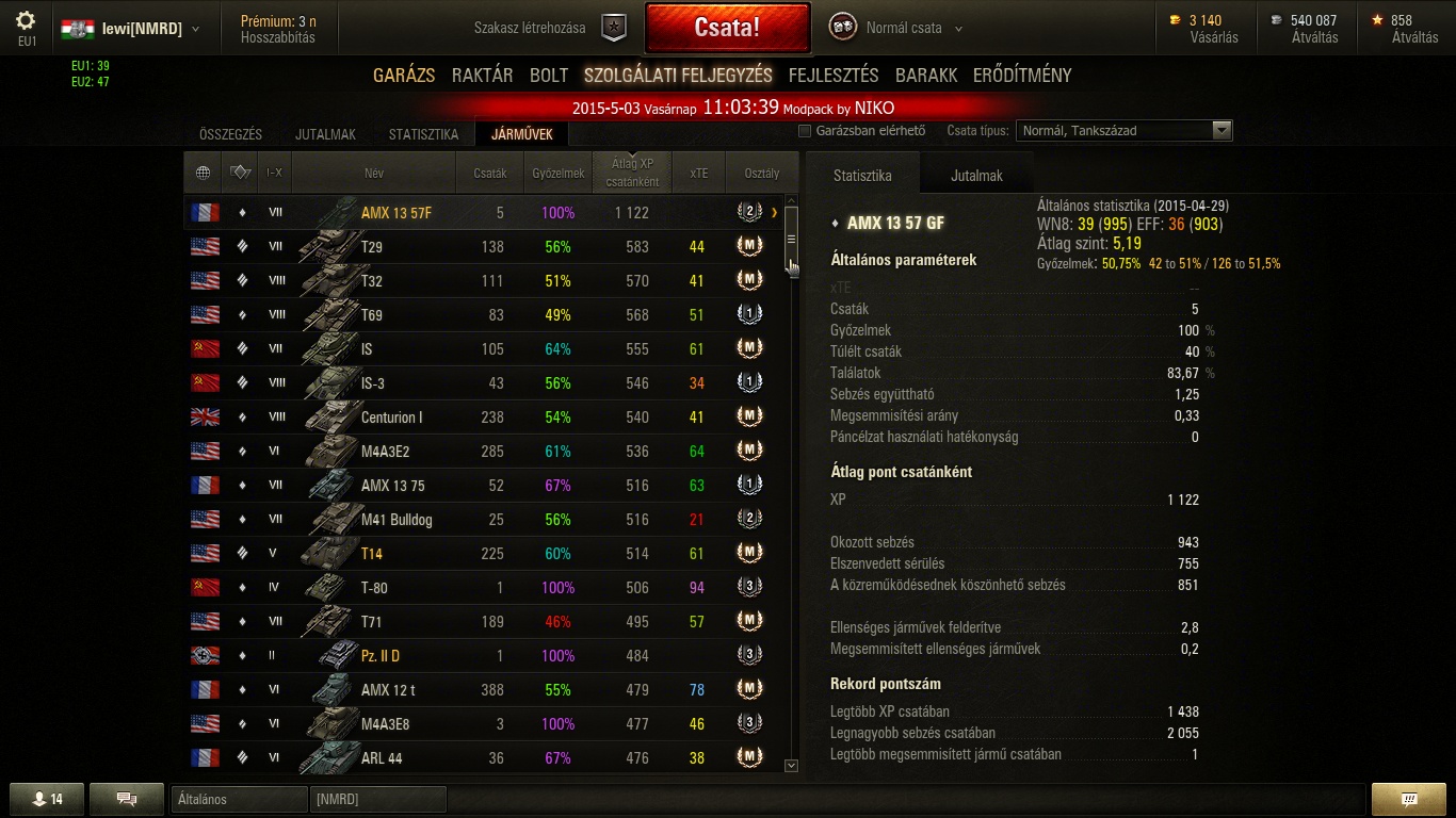 Először nagy élmény volt, de a 9.6 (ágyúnerfje is) nagyon betett neki, azóta is csak dühöngök sokszor. :angry: Nagyon hajlamos teljesen beszűkült célkörrel is épp csak elhibázni a tankot, többször volt 50% alatti találatom vele és volt pár 20-30%-os is. :blink: Ez elég gáz, mikor hull-down szituból kéne lőni a sebezhető pontokat.