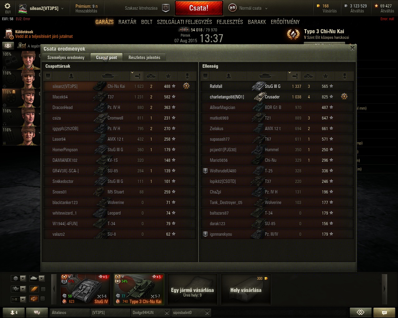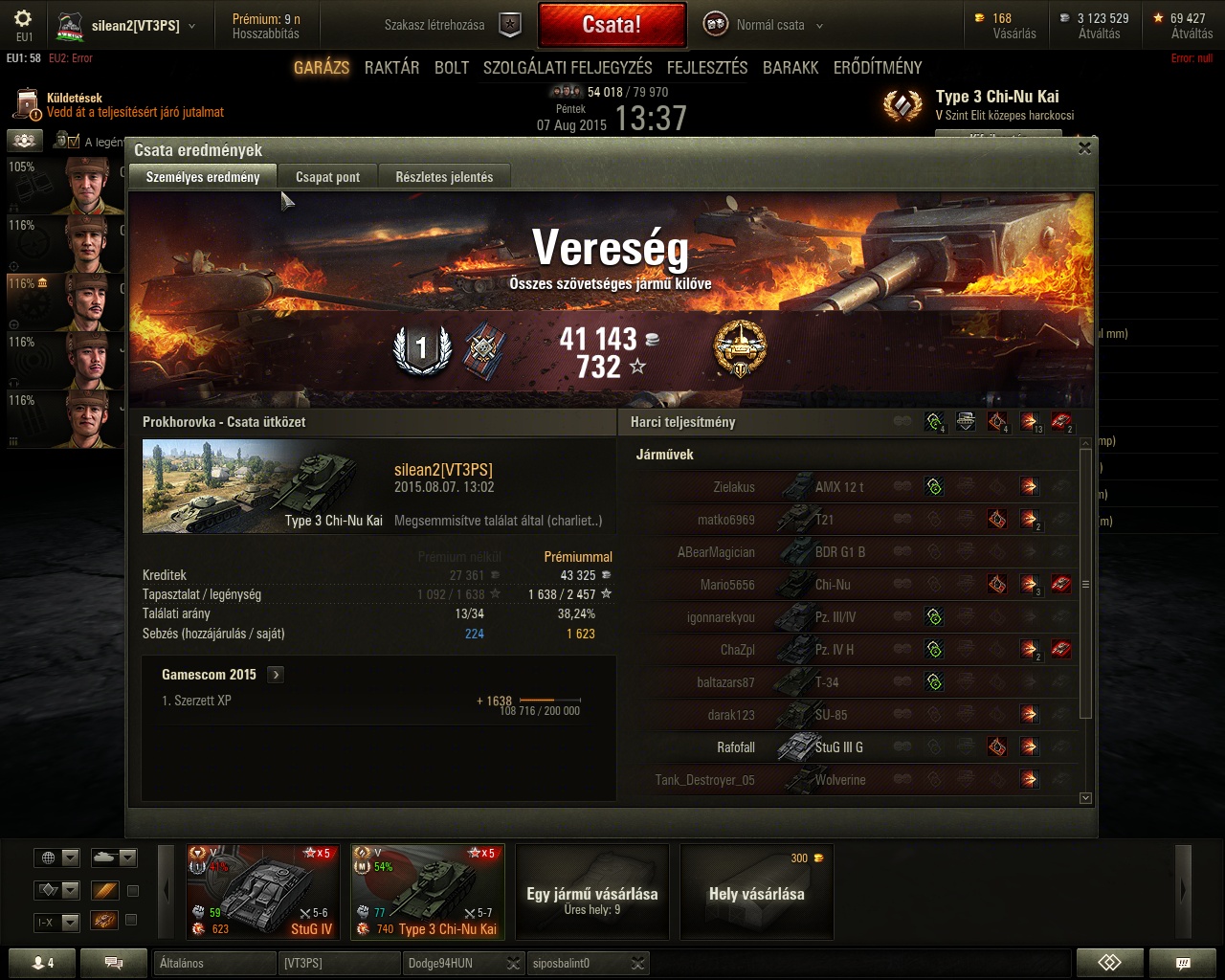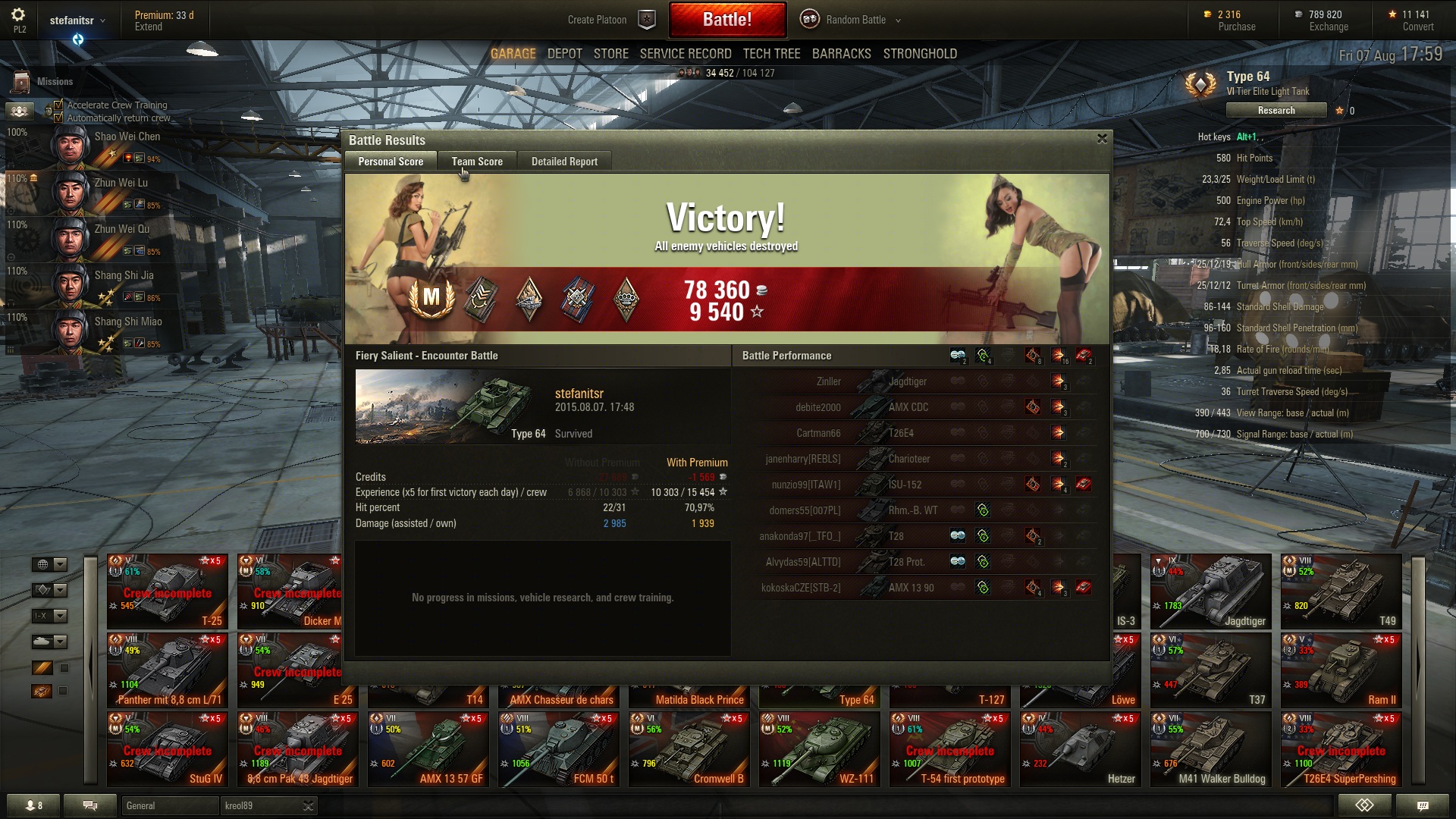 Most fogtam ki a mai nehezen csillagozható tankjaimat: M445, Tigerp, MBT és Firefly kérdéses, mert csak 1 kört mentem, kivéve a prémet. KV4 meg gyalázat győzelem volt, 300 sebzés, E100 kivégzett