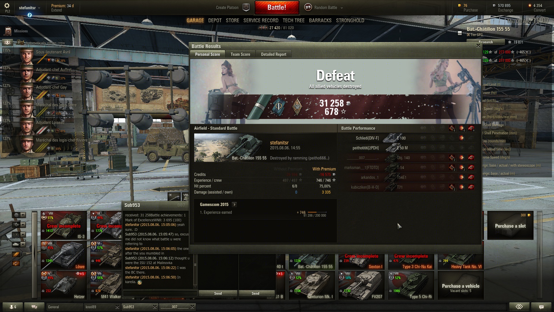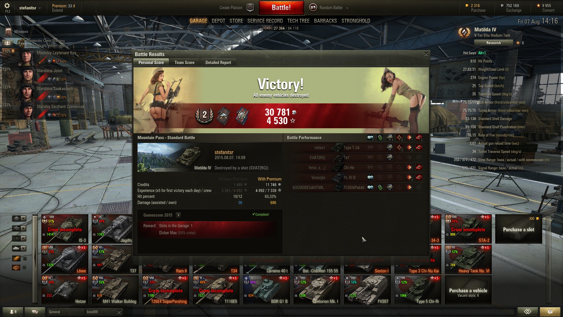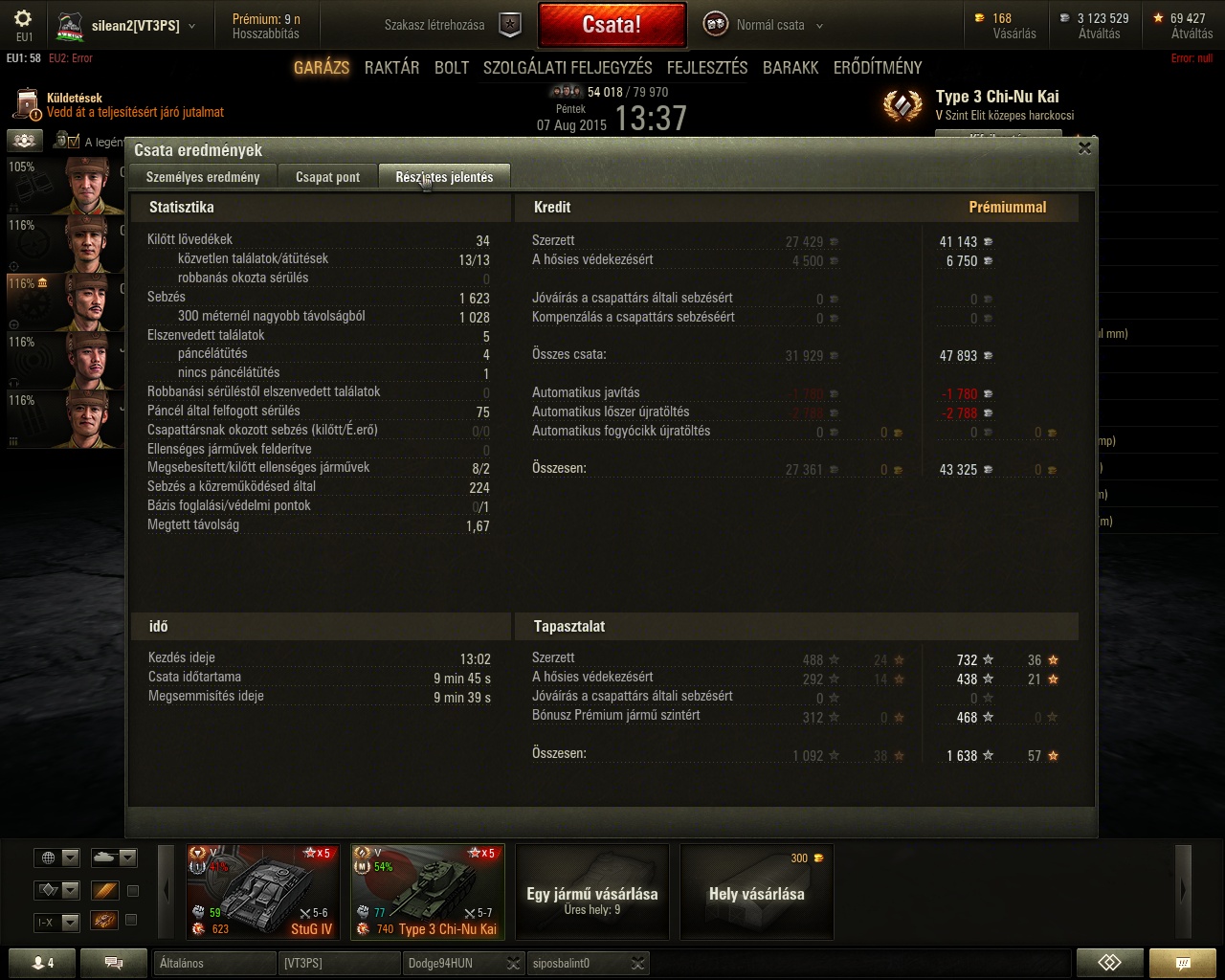Most fogtam ki a mai nehezen csillagozható tankjaimat: M445, Tigerp, MBT és Firefly kérdéses, mert csak 1 kört mentem, kivéve a prémet. KV4 meg gyalázat győzelem volt, 300 sebzés, E100 kivégzett
