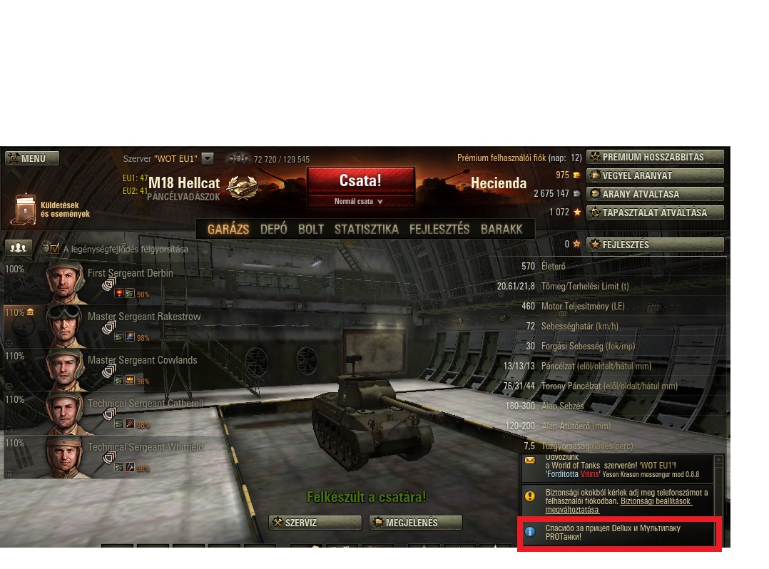 Háát igen...Szeretném a T57 hevyt,de T71-el kinlódok.Nem fekszik nekem a light stílus,de át kell rágnom magam rajta,ha akarom a végét .Ugyan ez a 6-os Francia light csoda,ráadásul azon még spot lámpám sincs,még 1 százalék kell.Is7 van tizesbe és igen szeretem felvenni a harcot míg mögöttem a hiénák várnak,hogy valaki eléjük jöjjön.Most próbálkozom a T28 proto-val,hátha több killem lesz...